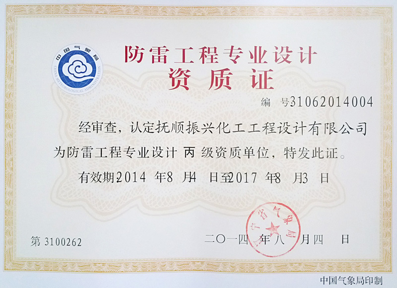 2014年8月4日,撫順振興化工工程設(shè)計(jì)有限公司通過(guò)防雷工程專業(yè)設(shè)計(jì)丙級(jí)資質(zhì)單位認(rèn)定,并取得防雷工程專業(yè)設(shè)計(jì)資格證。