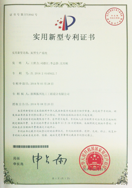 2014年8月20日撫順振興化工工程設(shè)計(jì)有限公司通過中華人民共和國國家知識產(chǎn)權(quán)局專利審查,并獲得“炭黑生產(chǎn)系統(tǒng)”實(shí)用新型專利證書。本專利有效期十年。
