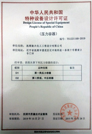 2015年10月28日,撫順振興化工工程設計有限公司獲得中華人民共和國特種設備設計許可證(壓力容器)。證書編號:TS1221168-2019 獲準從事D1、D2壓力容器設計。
