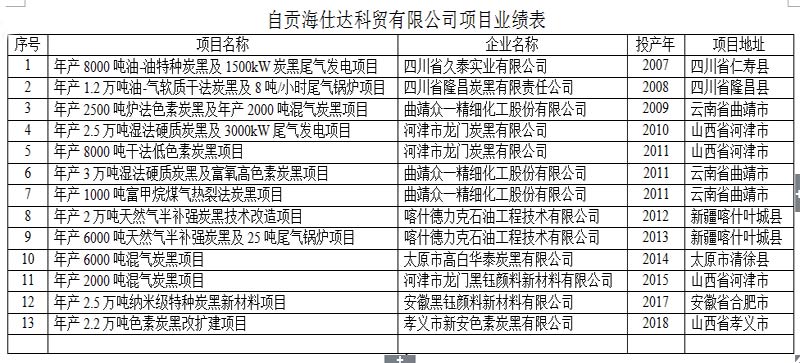 主要炭黑品種天然氣半補強、爐法色素炭黑、納米級特種炭黑、混氣炭黑、富氧高色素炭黑,干法低色素炭黑、化纖色母粒用炭黑、導電炭黑等(見業(yè)績表)。