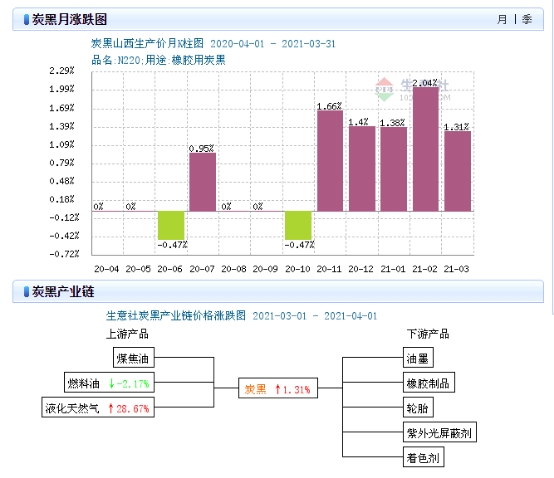 2021年第一季度國(guó)內(nèi)炭黑市場(chǎng)價(jià)格趨于穩(wěn)定。2021年3月N220炭黑均價(jià)7650元/噸,2021年4月2日N220炭黑價(jià)格7750元/噸,2021年4月N220炭黑月均價(jià)預(yù)測(cè):7451元/噸。