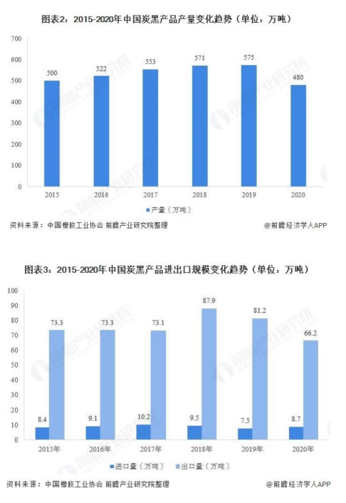 2015年以來(lái),我國(guó)炭黑產(chǎn)量呈現(xiàn)持續(xù)增長(zhǎng)勢(shì)頭,2019年,全國(guó)炭黑產(chǎn)量為575萬(wàn)噸,創(chuàng)階段新高。2020年,因新冠疫情期間開(kāi)工不足、原料緊張、需求下降等因素影響,國(guó)內(nèi)炭黑行業(yè)開(kāi)工率在60%左右,炭黑產(chǎn)能800萬(wàn)噸左右,炭黑產(chǎn)量480萬(wàn)噸,較上年同期出現(xiàn)較大幅度的下滑。